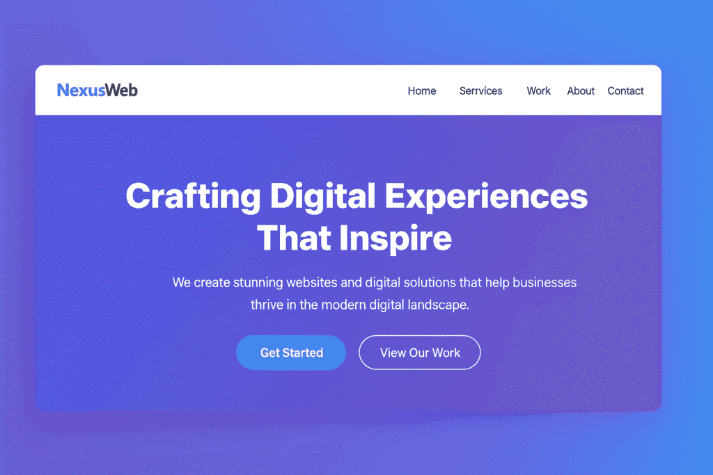 This modern layout features a sleek navigation bar, bold typography, and a captivating hero section that instantly grabs attention. The gradient background creates depth and emotion, while the clear call-to-action buttons like “Get Started” and “View Our Work” guide users toward meaningful interactions.
